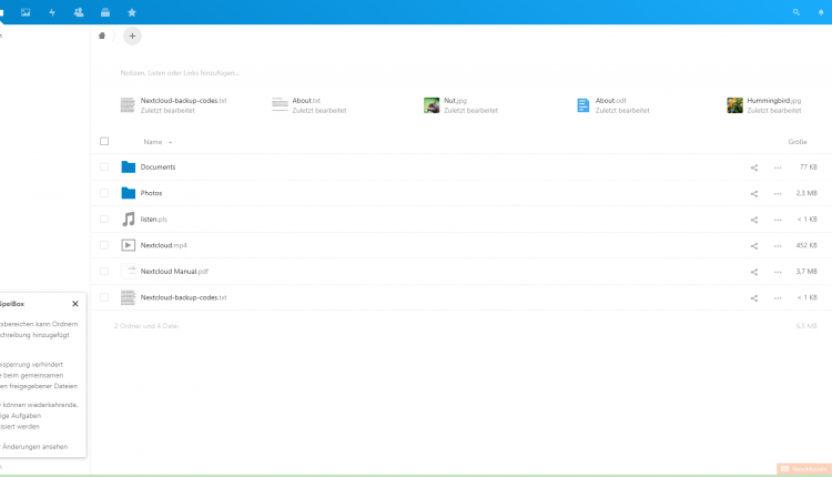 Neu ist die weitere Verschmelzung von projektbezogenen Tasks / Notizen und Ordnern auf Dateiebene. So lässt sich für jeden Ordner eine Beschreibung, Checkliste etc. anlegen, da die App Nextcloud Text (muss aktiviert werden) direkt in den oberen Bereich eines jeden Ordners eingefügt wird. Damit ist auch paralleles Arbeiten an diesen Ordnerbeschreibungstexten möglich: