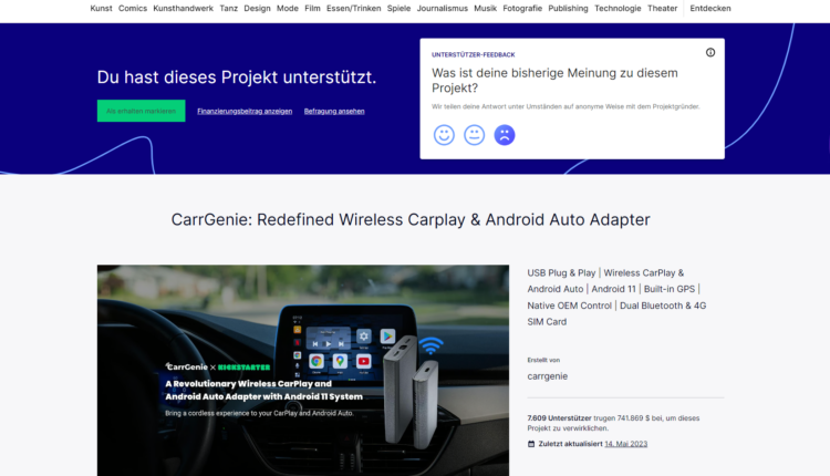 Ich hätte schon stutzig werden sollen, dass es technisch überhaupt nicht gehen kann: CarrGenie – mit einem USB Dongle bei Autos mit Display ohne Android Auto im System Android Auto booten können. Quasi das Infotainment System hijacken und ein anderes Betriebssystem am Auto booten, um dann mit dem Handy Android Auto zu haben bei Autos, die kein Android Auto im Infotainment System verbaut haben. Geht evlt. irgendwie, aber sicherlich nicht ohne tiefe Bauchschmerzen. Aber ich war voller Hoffnung und habe 90€ damals an Kickstarter und damit an den Projektinhaber überwiesen. Die Monate vergingen, die erste Frist für “wird versendet” ist verstrichen. Es kamen so gut wie keine Updates vom Projektinhaber, keine Fotos aus der Produktion, nichts. Natürlich an Kickstarter gewendet und die Verantwortlichen um Hilfe gebeten – mehrmals. Die sahen hier keinerlei Scam, weil letztlich wozu Projekte sperren und rücküberweisen, wenn man viel Geld auch mit Scam Projekten verdienen kann.